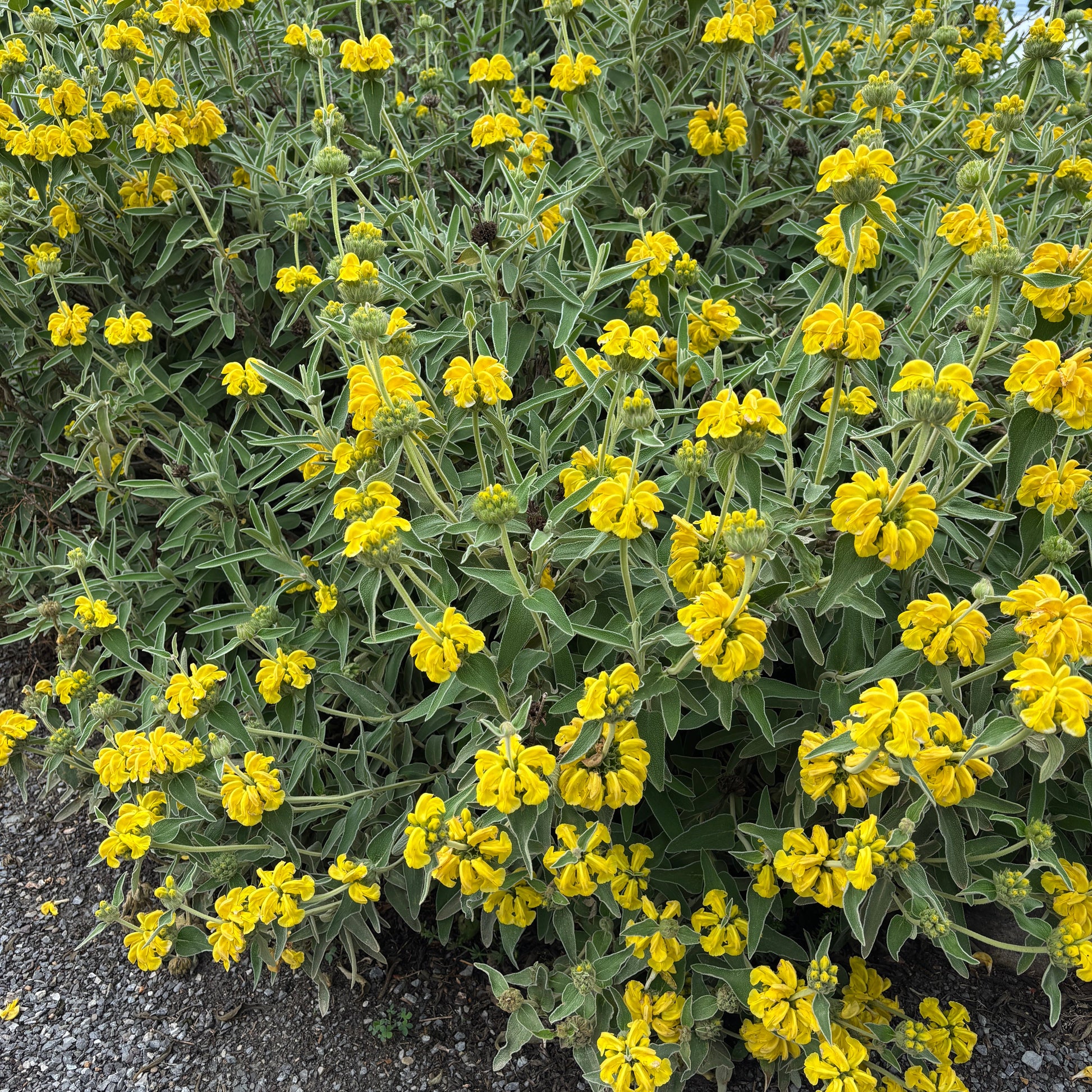 Jerusalem sage is a Mediterranean shrubby perennial with fuzzy gray-green leaves and lemon yellow flowers that clasp the stems in whorls. It brightens a garden bed and hearkens balmy weather. It will remain evergreen in warm zones (8-10) but will die back in the colder ones.