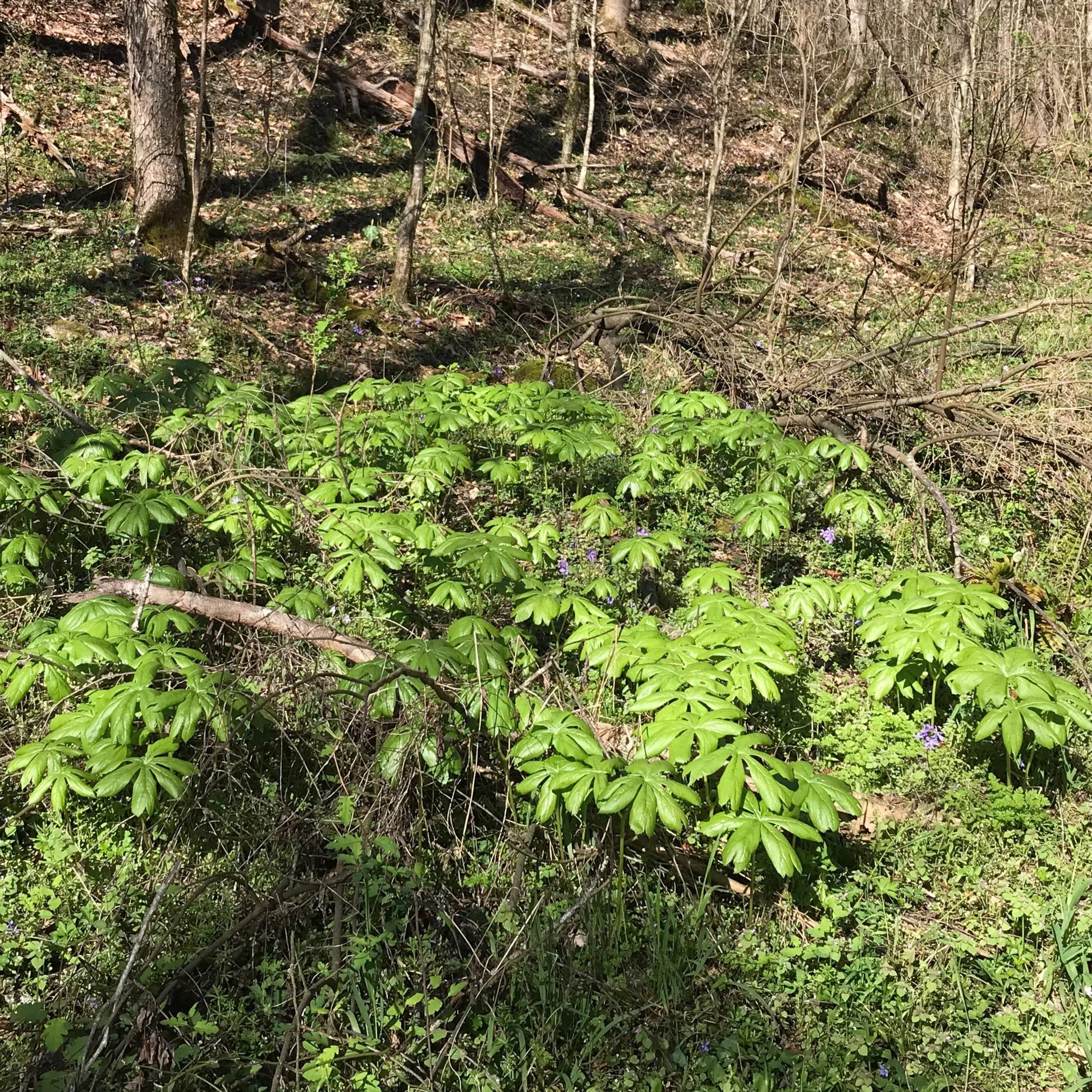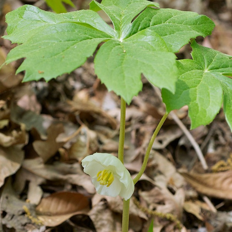 Mayapple, also known as American mandrake or umbrella plant, is native to rich woodlands in Eastern North America. It spreads by underground rhizomes to create gorgeous patches of distinctive umbrella-like foliage. This foliage stands out amongst the other flora on the forest floor, making it one of the first things we spot on our spring hikes.